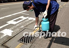 在香港“復活節”假期,全民總動員清潔香港預防病毒蔓延,21日衛生部門派出人員消毒馬路污水渠道。洪少葵 攝
