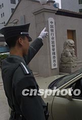 中國銀行業監督管理委員會二十八日正式掛牌。銀監會將行使原由中國人民銀行履行的監督管理職權。圖為武警戰士在銀監會門前執勤。作者:毛建軍