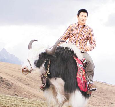 中新網5月13日電 香港藝人劉德華早前到云南麗江玉龍雪山拍攝最新一輯綠茶廣告,在上輯廣告中,導演找來老虎BB跟華仔合作,而這居然是雪山牦牛跟華仔做拍檔,在一片草原上華仔優哉游哉扮牧牛郎,構成一幅優美的風景畫。