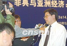 博鰲亞洲論壇《SARS與亞洲經濟的影響評估與政策建議研討會》五月十三日開始在北京舉行,圖為出席會議的亞洲開發銀行北京辦事處首席經濟學家湯敏接受記者訪問。