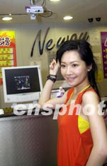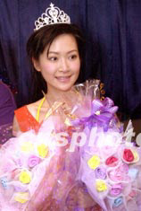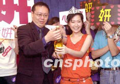 歌星關心妍5月14日出席在香港尖東Neway卡拉OK舉行新歌祝捷會。熱情的歌迷除送上鮮花外,更別出心栽送上皇冠頭飾。中新社傳真 鄧慶樂 攝