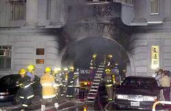 據(jù)了解,“交通部”的正門(mén)口15日晚間7時(shí)28分燃起熊熊大火,一輛掛在桃園龜山友立公司的小貨車(chē),從桃源街又轉(zhuǎn)后即直沖“交通部”門(mén)口,駐守警衛(wèi)緊急聯(lián)絡(luò)消防人員,19輛消防車(chē)緊急趕往現(xiàn)場(chǎng),火勢(shì)約在20分鐘內(nèi)撲滅,辦公室內(nèi)加班員工及數(shù)十名媒體記者所幸安然無(wú)恙,但“交通部”正門(mén)口已被兇猛的火勢(shì)燒得一片焦黑,火焰甚至高達(dá)4樓。