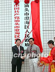 廣東汕頭澄海五月十九日舉行撤市設(shè)區(qū)揭牌儀式,汕頭市長李春洪(右二)和澄海區(qū)長陳棉生(左二)揭牌。作者:王惠存