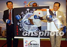 香港推出“吃喝玩樂Come Back Hong Kong”運動。“吃喝玩樂Come Back Hong Kong”運動五月十九日在香港展開,其旨在鼓勵香港市民拋開對非典型肺炎疫情的憂慮,重新投入積極的生活。圖為香港總商會總裁翁以登(左)、香港餐飲聯業協會會長伍德良(右)等擊打“SARS病毒”從而為該活動揭幕。中新社記者:潘索菲
