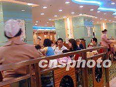 世界衛生組織解除了對香港發出的旅游警告,使一度沉寂的酒樓食肆霎時熱鬧起來.圖為市民在周末除下口罩享受美味佳肴.中新社傳真 洪少葵 攝
