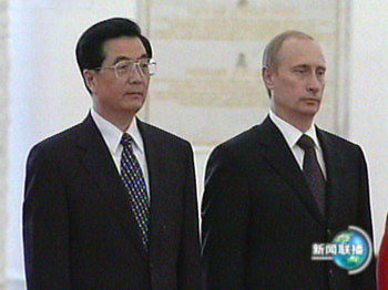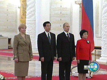 胡錦濤主席與俄羅斯總統(tǒng)普京當?shù)貢r間二十七日下午在克里姆林宮祖母綠廳共同會見中外記者。胡錦濤在回答俄方記者提問時作上述表示。