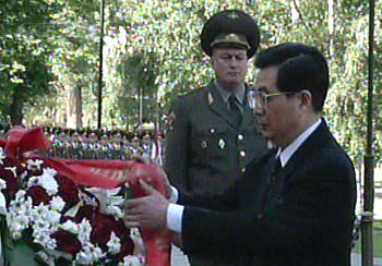 今天是胡錦濤主席訪俄的第二天。當?shù)貢r間今天上午,胡錦濤主席向無名烈士墓敬獻了花圈,并參觀了俯首山衛(wèi)國戰(zhàn)爭博物館。中午,普京總統(tǒng)在克里姆林宮為胡錦濤主席舉行了歡迎儀式并進行小、大范圍會談。會談結(jié)束后,兩國元首簽署了中俄聯(lián)合聲明等三個文件。