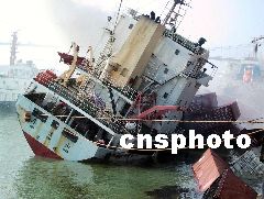 據悉,該船是混裝船,其中裝有化學品甲苯本烯酸20噸,過硫酸納20.16噸和過氧化氫16噸。共總有100多集裝箱。據相關人員介紹,此次救助活動中,沒有造成水域和空氣的污染。劉賢靈 攝