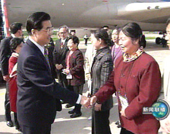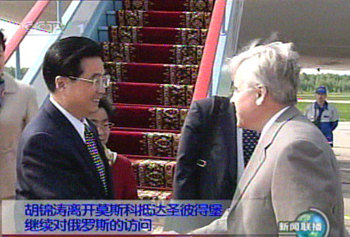 中新社圣彼得堡五月三十日電(記者張朔)中國國家主席胡錦濤當地時間三十日上午乘專機從俄羅斯首都莫斯科飛抵俄第二大城市圣彼得堡,出席圣堡建市三百周年慶典。