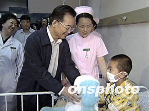 溫家寶來(lái)到11歲的湖南女孩許碧玉的病床前,關(guān)切地詢問(wèn)病情和家庭情況,鼓勵(lì)她堅(jiān)定戰(zhàn)勝疾病的信心,叮囑醫(yī)護(hù)人員要精心治療和護(hù)理,讓孩子們?cè)缛湛祻?fù)。