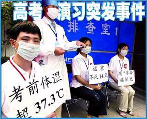 據(jù)北京青年報(bào)報(bào)道,昨天14點(diǎn)50分,101中學(xué)考點(diǎn)考生開始進(jìn)入考點(diǎn)。由老師扮演的考生一一走過“驗(yàn)證處”,老師進(jìn)行嚴(yán)密排查,不久,“忘帶健康卡”、“考前體溫超過37.3攝氏度”、“返京不足14天”、“有‘非典’接觸史”、“健康卡兩章不全”、“忘帶準(zhǔn)考證”等各種“問題考生”舉著醒目的標(biāo)牌,在引導(dǎo)老師的帶領(lǐng)下一一被臨時(shí)“安置”。“問題考生”的問題得到解決后,與其他考生一樣進(jìn)行體溫測試。進(jìn)入校門的考生在工作人員的指引下,先在臨時(shí)洗手池洗手消毒,然后按照考場示意圖去考場位置。