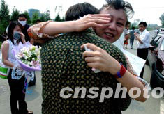 北京一位母親六月三日上午在小湯山戰(zhàn)地醫(yī)院門前,終于盼到患“非典”住院一個(gè)多月的兒子痊愈出院,母子頓時(shí)激動(dòng)地緊緊擁抱在一起。中新社記者:賈國榮