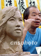 香港新世紀論壇與藝術界六月九日在香港舉行“為香港英勇殉職的醫護人士塑像發布會”,圖為香港藝人朱達誠在發布會上向媒體介紹有關雕塑英勇殉職的謝婉雯醫生銅像詳情。錢興強 攝