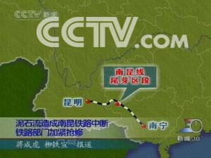 據(jù)中央電視臺(tái)報(bào)道,9日零時(shí),因連降暴雨,南昆鐵路尾芽區(qū)段多處被泥石流掩埋道床、沖空線路。尤其是總長3公里的盤龍山隧道口塌下1萬立方米的泥石流,導(dǎo)致近百米線路被掩埋,厚度達(dá)6米,隧道內(nèi)有一公里多線路嚴(yán)重積水,有些險(xiǎn)段搶險(xiǎn)人員一時(shí)無法接近,給搶險(xiǎn)工作增加了很大難度。