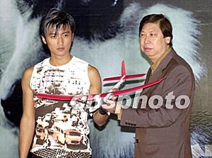 歌星謝霆鋒6月11日在香港舉行新碟發(fā)布會,英皇娛樂高層吳雨向霆鋒送上模型飛機,祝賀其歌唱事業(yè)將一飛沖天。鄧慶樂 攝