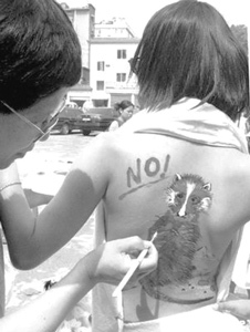 問題是,如今的人體彩繪,已不滿足于在藝術殿堂里,而是在室外在大庭廣眾之下大行其道,其目的也不是要普及什么藝術文化,所圖的或許只有一個動機,那就是為商家推銷商品。這就值得認真分析了。