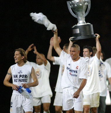 皇家馬德里隊必須贏得這場比賽才能確保贏得聯賽冠軍,為此全部精英首發上場,迎戰畢爾巴鄂隊。“外星人”羅納爾多當天還特意理了一個在去年世界杯賽期間理過的發式參賽,并在這場比賽中發揮得淋漓盡致,一人獨中兩元,為皇家馬德里隊奪取冠軍立下汗馬功勞。開場僅9分鐘,羅納爾多近射得手,使得皇家馬德里隊以1:0領先。第三十六分鐘時,畢爾巴鄂隊的阿爾基薩攻進一球,將比分扳成1:1平。上半場快結束時,巴西球星卡洛斯門前主罰任意球,將球直接踢進對方的球門。第六十一分鐘,羅納爾多錦上添花,將比分鎖定為3:1。
