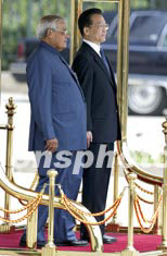 中國國務院總理溫家寶二十三日上午在北京人民大會堂東門外廣場舉行儀式,歡迎來訪的印度總理瓦杰帕伊。中新社記者:毛建軍