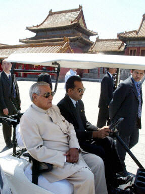 6月24日,印度總理瓦杰帕伊在陪同人員陪同下游覽了北京歷史悠久的故宮。今天上午在北京西郊玉泉山,中央軍委主席江澤民會見了印度總理瓦杰帕伊。