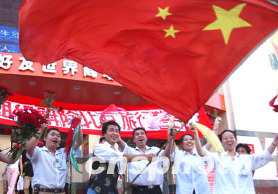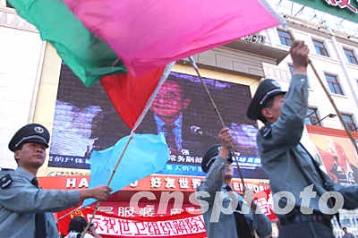 王府井的一家專賣店里別出心裁地放起了薩克斯版的《回家》,這里的老板說,他們希望市道重振,能盡快向SARS之前的水平回歸。這家店的對面——中國照相館門前,五星紅旗與黨旗齊舞,數十只彩色氣球被派發或放飛天際,為北京祈福。