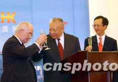 香港特首董建華、財(cái)政司長(zhǎng)梁錦松及投資推廣署長(zhǎng)盧維思,6月24日在禮賓府特設(shè)酒會(huì),舉杯祝賀來港投資的中外企業(yè)代表在港開業(yè)擴(kuò)充業(yè)務(wù)。 中新社記者 洪少葵