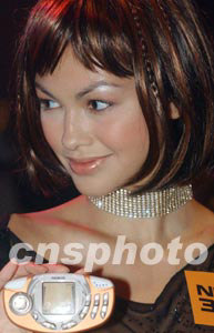 諾基亞六月二十五日晚在香港舉行產品發布會,推出新款流動電話3300。圖為香港名模Rosemary展示新款手機3300。 中新社記者 錢興強