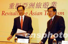 博鰲亞洲論壇秘書長龍永圖(右)、香港財政司司長梁錦松,六月二十六日在香港舉行記者會,公布“新形勢下的國際旅游合作大會──重振亞洲旅游業”的詳情。該會議將于七月十四日至十五日在香港舉行。中新社記者 潘索菲