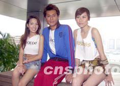 影視紅星古天樂6月27日在香港出席首張寫真AVCD發布會,大會特別安排美女相伴左右為他造勢。中新社記者 鄧慶樂