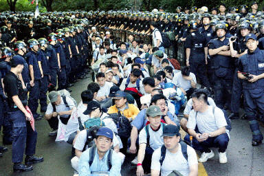 目擊者說,大約5400名鎮(zhèn)暴警員沖入漢城中部的延世大學,當時約有1500名鐵路工人在這所大學靜坐罷工。