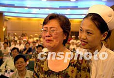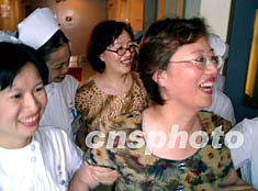 中新社廣州七月二日電 (記者王華)廣東省最后三名非典病人今天上午全部康復(fù)出院,患者與醫(yī)護人員相互擁抱慶賀。廣東省副省長雷于藍等有關(guān)負責(zé)人參加了歡送會。