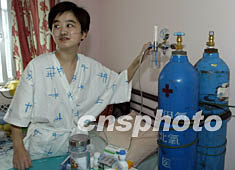 7月2日,三十歲的楊冬梅在陽光明媚的家中熟練地操作吸氧開關。楊冬梅5月16日身染SARS病毒后病情危殆,經過有創機械通氣等治療搶救奇跡般康復,上周五從宣武醫院出院。她是北京數十名采用有創機械通氣治療患者中幸存的三人之一,目前在家中間斷吸氧和服藥,精神和身體狀況一天比一天好。中新社記者 任晨鳴 攝