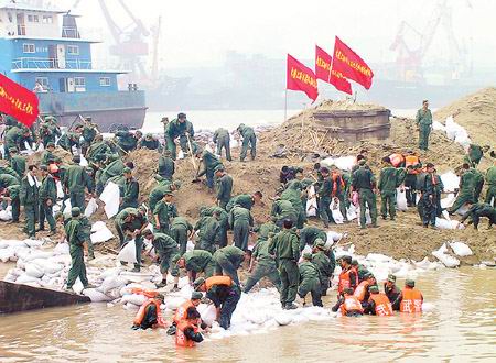 記者今天上午在現場看到武警上海總隊第9支隊3中隊的數百名官兵身穿桔紅色救生衣,有的在碼頭上搬運沙袋,有的站在齊腰深的積水里修筑堤壩。這些戰士們從昨天凌晨進入現場搶險后,分批投入戰斗,至記者發稿時已經連續戰斗了30多個小時。