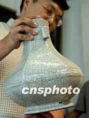 多件明清皇帝珍愛的瓷器將于七月中旬在北京華辰春季拍賣會上亮相。清代雍正和乾隆兩帝酷愛宋瓷而仿哥釉六方貫耳瓶,首次向國內外公私收藏界展現,估價八十萬元人幣。中新社記者 賈國榮 攝