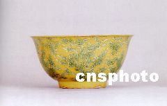 圖為明嘉靖黃地綠彩福祿壽紋碗,將松竹梅與福祿壽和云芝石融為一體,未見海內外公私收藏著錄,估價四十五萬元人民幣。中新社圖