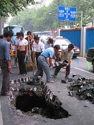 據(jù)介紹,南京的地質(zhì)狀況較復(fù)雜,地下水位高,有較多的古河道及大量含水砂層、斷裂破碎帶、軟流塑地層等不同地質(zhì)情況。昨日塌陷的兩處位于新街口鬧市區(qū),一處在三元巷加油站門(mén)口,另一處在新街口轉(zhuǎn)盤(pán)的東南角。兩處塌陷時(shí)間大約在下午4時(shí)左右,塌陷后沒(méi)有造成人員傷亡,但給新街口的交通造成一定影響。市政部門(mén)立即在塌陷處設(shè)置了警示標(biāo)志,并有交警在現(xiàn)場(chǎng)指揮交通。下午5時(shí)多,南京市政110的趕來(lái)?yè)屝蕖?/p>