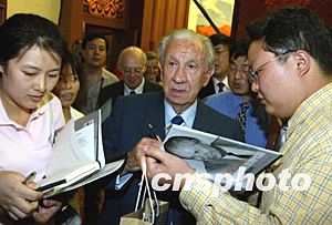 薩馬蘭奇為出席首發式的中國人民解放軍副總參謀長熊光楷在新書上簽名。中新社記者:毛建軍