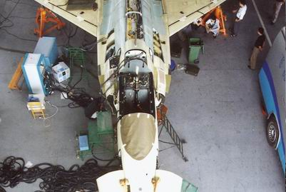 要想一睹“超七”的真顏可不是一件簡單的事:進入成飛試飛站之前,工作人員就提醒記者種種注意事項;通過武警層層把關的大門后,試飛場左側的一機庫門前又見到兩名武警持槍而立……走進機庫,“這就是‘超七’試飛站!彪S行的工作人員輕聲告訴記者。