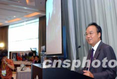 澳門社會事務及文化司長崔世安在香港出席“新形式下國際旅游合作大會”部長圓桌會議時,不忘向業界人士推介澳門旅游業。中新社記者:洪少葵
