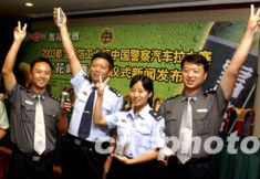 2003都寶鋁箔工業杯中國警察汽車拉力賽七月十六日在北京舉行天安門首發儀式新聞發布會。賽事匯聚了包括香港、澳門在內的八十名中國警界精英,是中國建國以來規模最大、范圍最廣、距離最長的一次警察汽車賽事。圖為發布會上參賽代表斗志昂揚。中新社記者:武仲林