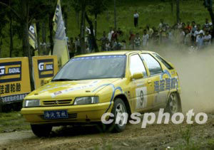 2003年中國(guó)汽車?yán)惖诙颈荣?6日在吉林省長(zhǎng)春市雙陽(yáng)區(qū)舉行,來(lái)自全國(guó)的56輛賽車參加本次比賽,46輛賽車完成了第一天的比賽,圖為曾在第一站比賽中駕駛東風(fēng)雪鐵龍·神龍富康車的北京海駕車手周勇在比賽中。中新社記者:趙振清