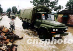 解放軍南京軍區(qū)急調軍車,向七月中旬淮河行洪區(qū)的安徽省阜陽地區(qū)運送救災品。當?shù)剞r村到處是內澇洪水,車隊涉水直奔災區(qū)。作者:閆宏宇