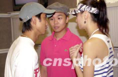 歌星黃伊汶、梁奕倫、范振鋒(右起)7月18日出席香港電臺節目《娛樂滿天星》訪問,三人同屬環球唱片公司,節目未開始時聚首交頭接耳了解事情最新動態。中新社記者:鄧慶樂