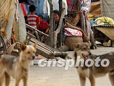 七月中旬的淮河洪水災區,背井離鄉的受災百姓如今在路邊堤上臨時棲身。晴天曝曬使地面溫度高達攝氏四十度以上,塑料棚內悶熱難當。政府日前正從各地調集救災帳篷。中新社記者:賈國榮