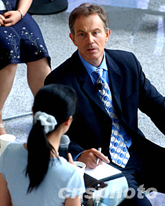 英國首相布萊爾七月二十二日在北京清華大學傾聽一位研究生的提問。中新社記者:賈國榮