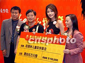 麥當勞“搖滾薯條”形象代言人陳慧琳七月二十二日下午現身廣州,在海珠廣場麥當勞分店參加了一系列的推廣活動。當天廣東三元麥當勞公司向陳慧琳兒童基金捐款十五萬元人民幣。作者:梁永強
