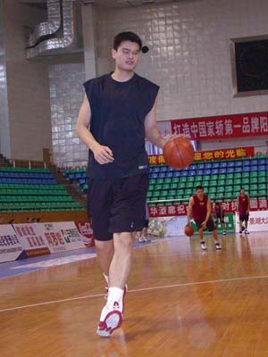 今天早上九點三十分,姚明和其他隊員一起進行了全過程的賽前訓練。今天的姚明狀態稍顯疲倦,但昨天還包扎在眉頭上的紗布已經摘了下來。