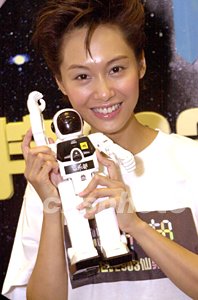 影星朱茵開心展示商臺送給她的航天員模型。作者:鄧慶樂