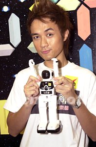 歌影紅星古巨基手持航天員模型,展露童心未泯的笑容。作者:鄧慶樂