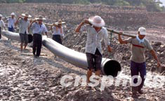 浙江玉環縣的淡水資源本來就十分緊缺,持續一個多月的旱情更是火上澆油,使該縣60%的人口(約30萬人)飲用水發生困難。為此,玉環縣緊急撥出1450萬元,鋪設17公里長的跨海穿河管道,實施北水南調。8月1日,施工人員冒著酷暑在灘涂下埋設水管,爭取早日完工。作者:鐘袁