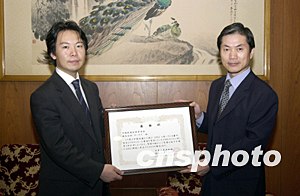 由中國新聞社日本分社與日本新秦公司聯合發起的防治“非典”網上募捐活動日前結束,南起沖繩,北至北海道,日本民眾、團體及在日華僑華人踴躍捐資,五十七萬日元捐款8月1日送交中國駐日大使館,請其轉交中國有關部門。圖為中國駐日使館李文亮參贊向新秦社長端木正和授予感謝狀,并請他轉達對各位捐款者的衷心感謝。中新社記者:陶光雄